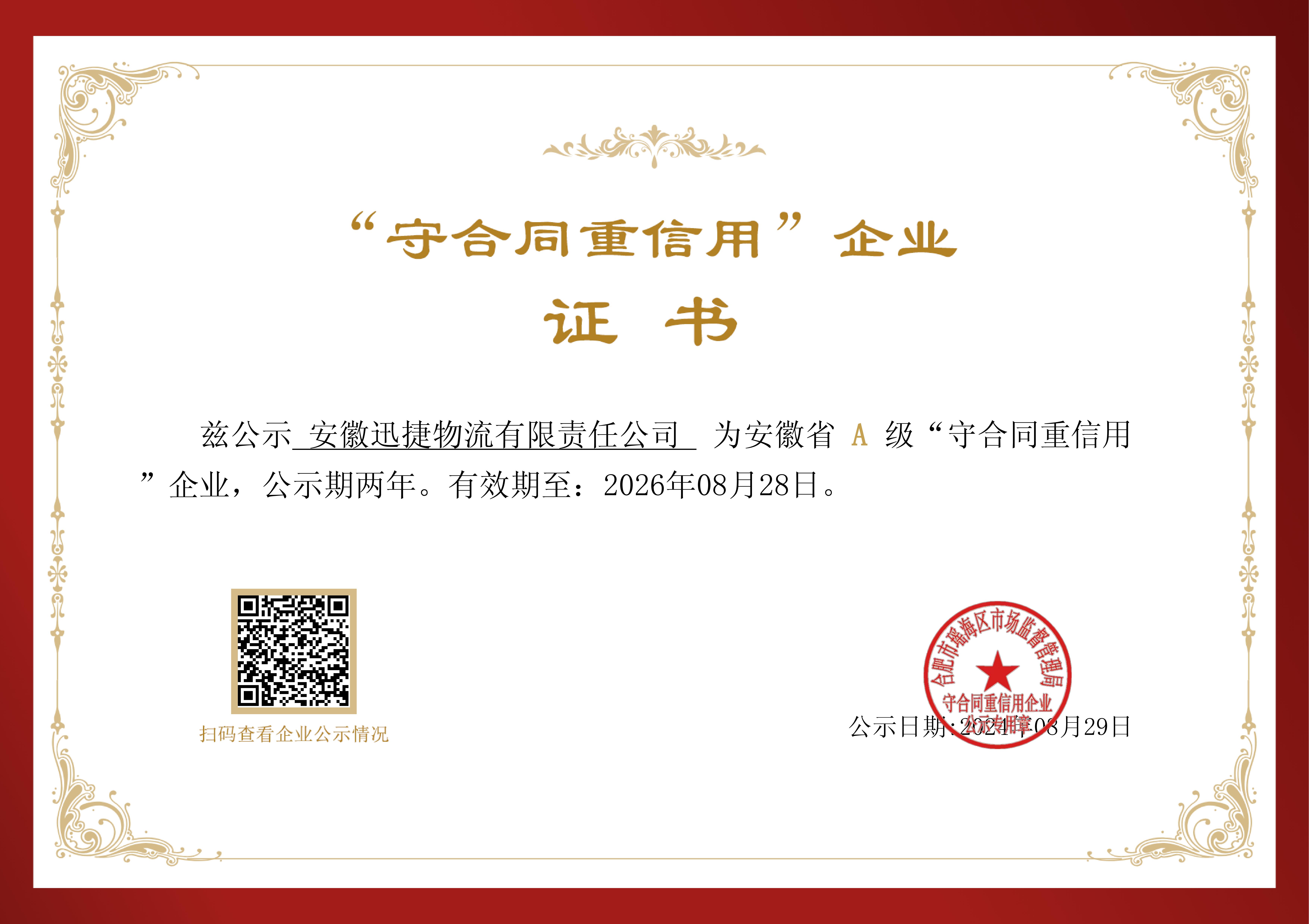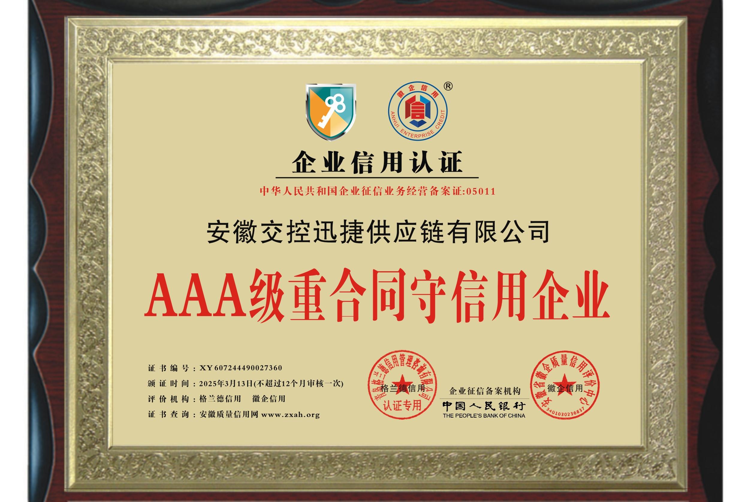 迅捷供應(yīng)鏈公司獲評“AAA級重合同守信用企業(yè)”
